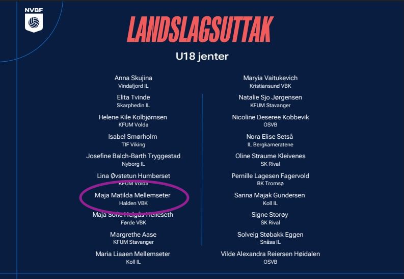 Vi er stolte over å dele at Maja Matilda Mellemseter er tatt ut til landslagssamling med U18-landslaget for jenter i volleyball. Det er en velfortjent anerkjennelse av alt hun legger ned av innsats.